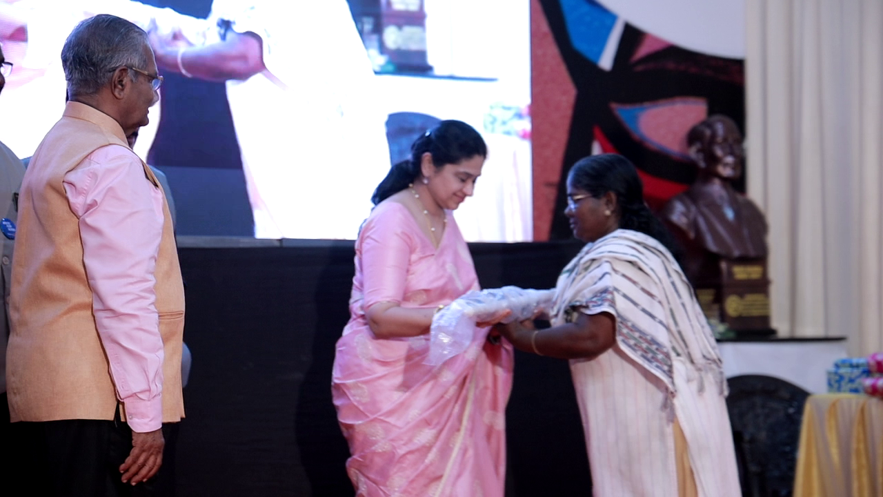 Guest of Honour Rtn. AKSM Rajasree V Nair handing over Hawker umbrella to a widow. Rtn MD Col K G Pillai is looking on.